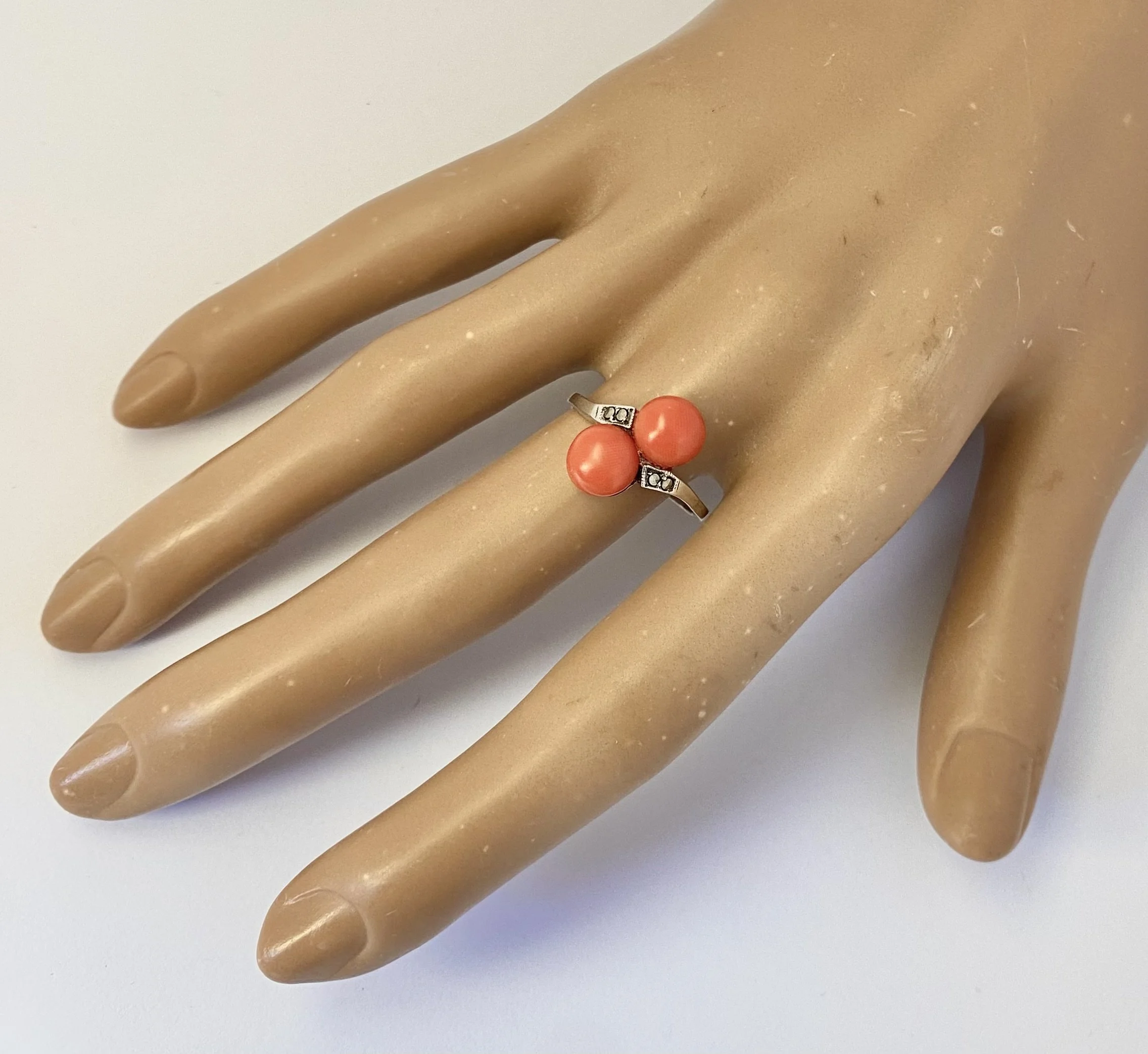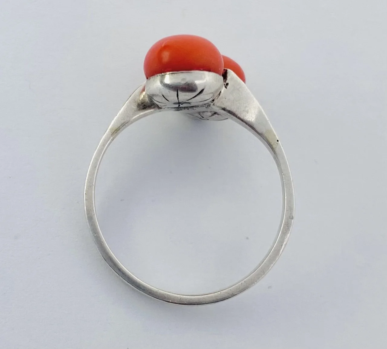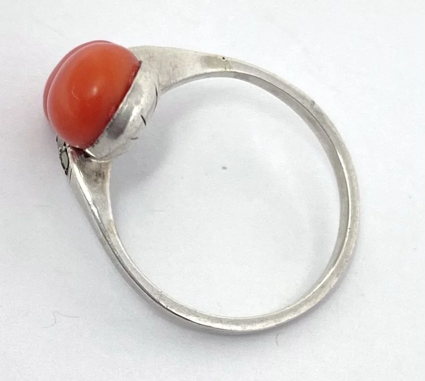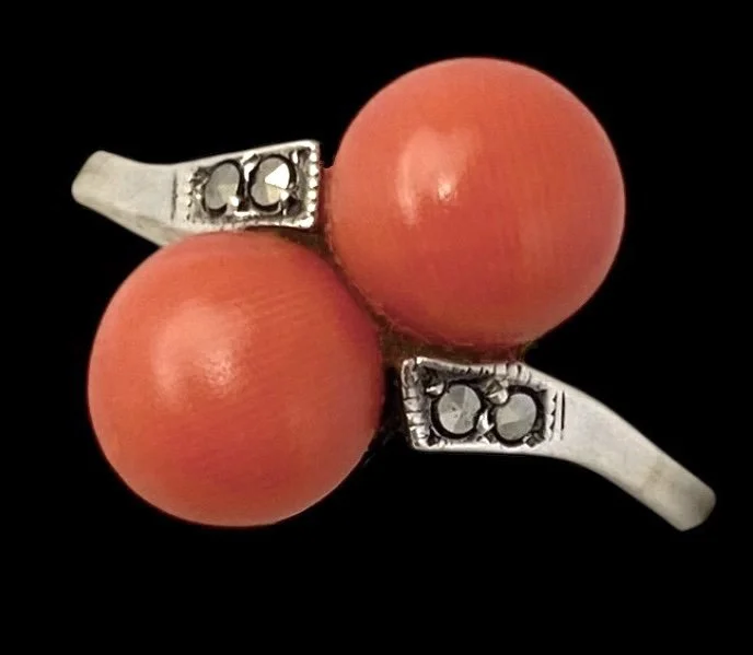 Antique Art Deco Era Silver, Natural Coral and Marcasite 'Toi et Moi' Ring